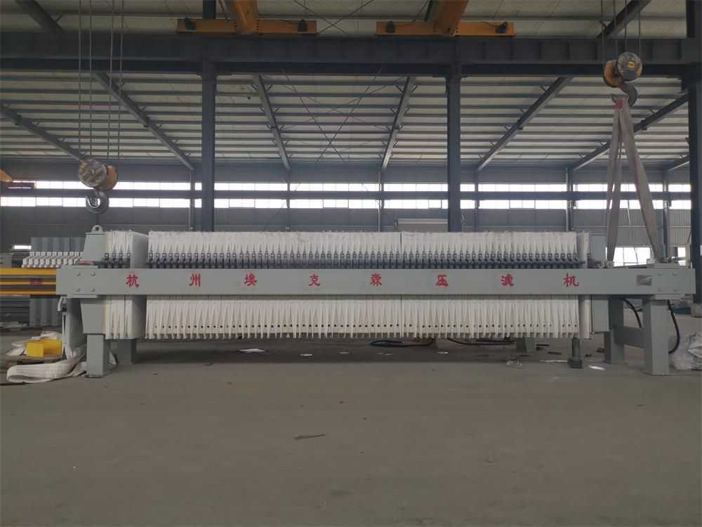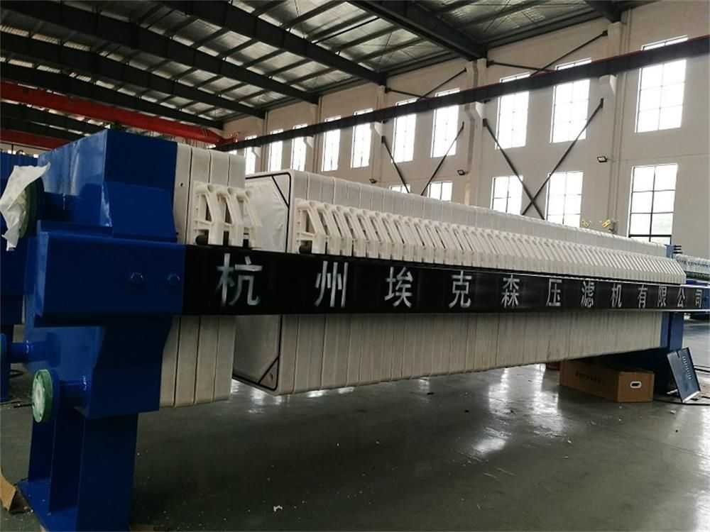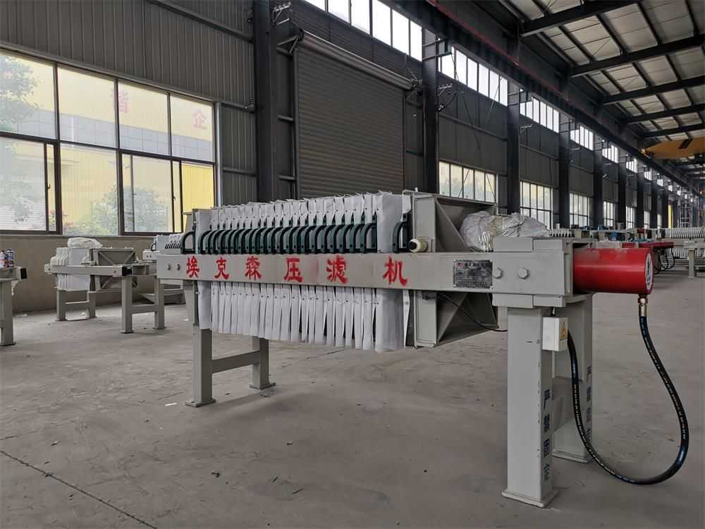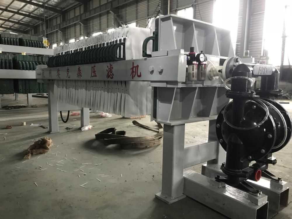 隔膜壓榨壓濾機是由隔膜板和廂式濾板排列組成濾室,在輸料泵的壓力作用下將料漿輸入濾室,通過過濾介質(zhì)(濾布)將料漿中的固體和液體分離,當料漿中的固體形成餅后,再向隔膜通入空氣,對濾室內(nèi)的固體充分壓榨。