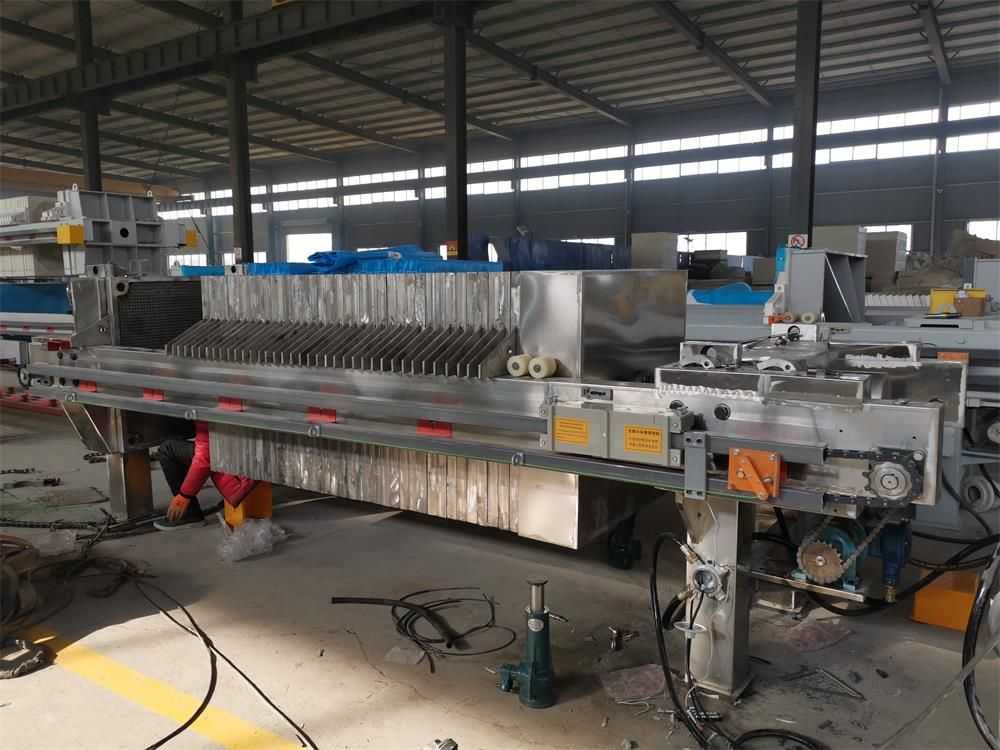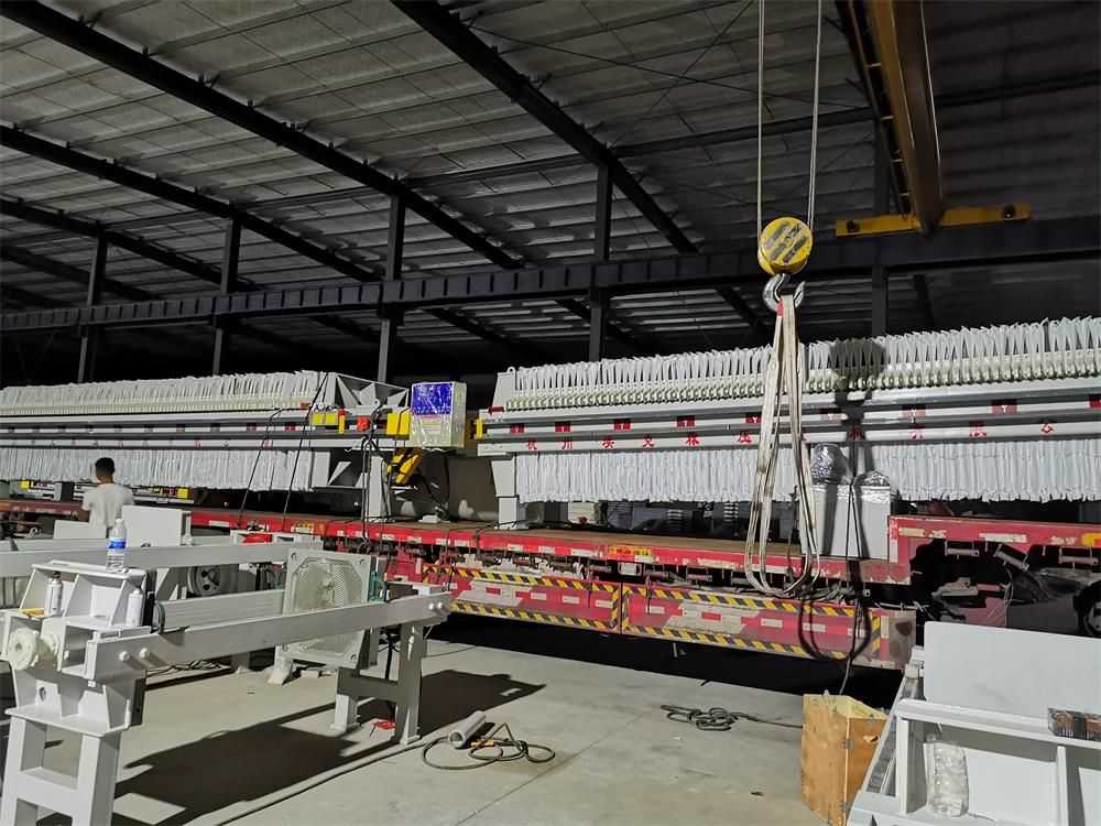 液壓廂式壓濾機由交替排列的濾板和濾框構成一組濾室。濾板的表面有溝槽,其凸出部位用以支撐濾布。濾框和濾板的邊角上有通孔,組裝后構成完整的通道,能通入懸浮液、洗滌水和引出濾液。板、框兩側各有把手支托在橫梁上,由壓緊裝置壓緊板、框。板、框之間的濾布起密封墊片的作用。由供料泵將懸浮液壓入濾室 在濾布上形成濾渣,直至充滿濾室。濾液穿過濾布并沿濾板溝槽流至板框邊角通道,集中排出。過濾完畢,可通入清洗滌水洗滌濾渣。